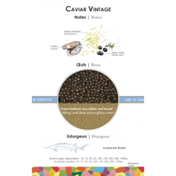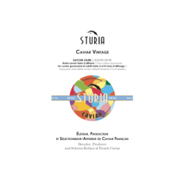 Vintage caviar is the best ambassador for Sturia! Its roes are shiny and firm, associated with a fruity and iodized explosion of flavor in the mouth.